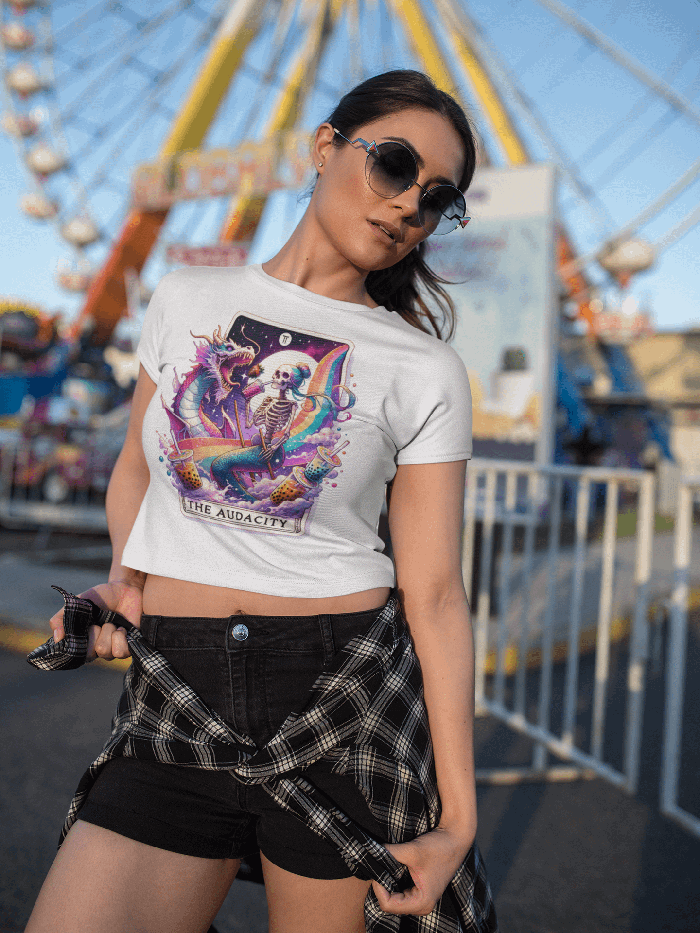 crop top featuring a bold skeleton and dragon design. Perfect for standing out at any event or festival!